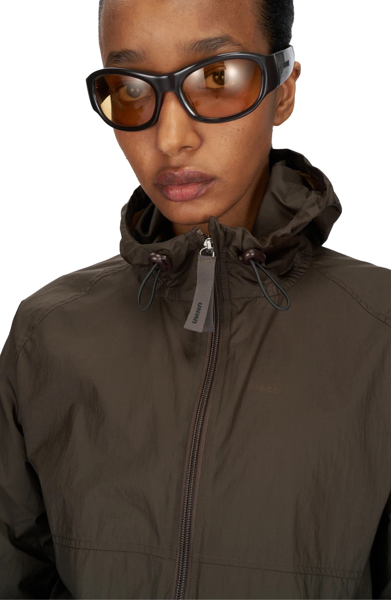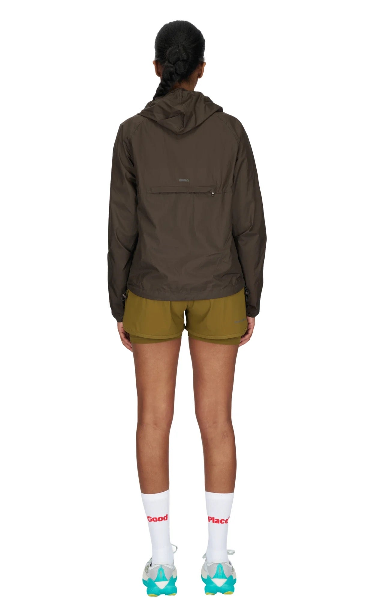Women's ultra-lightweight running jacket (55g/m²) in Wren Brown. It features an adjustable hood, two side pockets, a back pocket, and side vents for enhanced ventilation. It is equipped with adjustable straps at the hem for a customizable fit. Made from 100% recycled nylon, it offers protection against wind and light rain. Additionally, it is packable, PFC-free, and features a reflective UNNA logo on the back, along with a UNNA patch on the zipper.